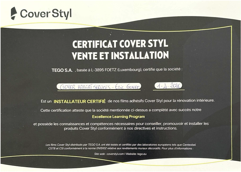 Pour les prestations de covering, j’ai suivi une formation professionnelle Cover Styl / Tego S.A. International